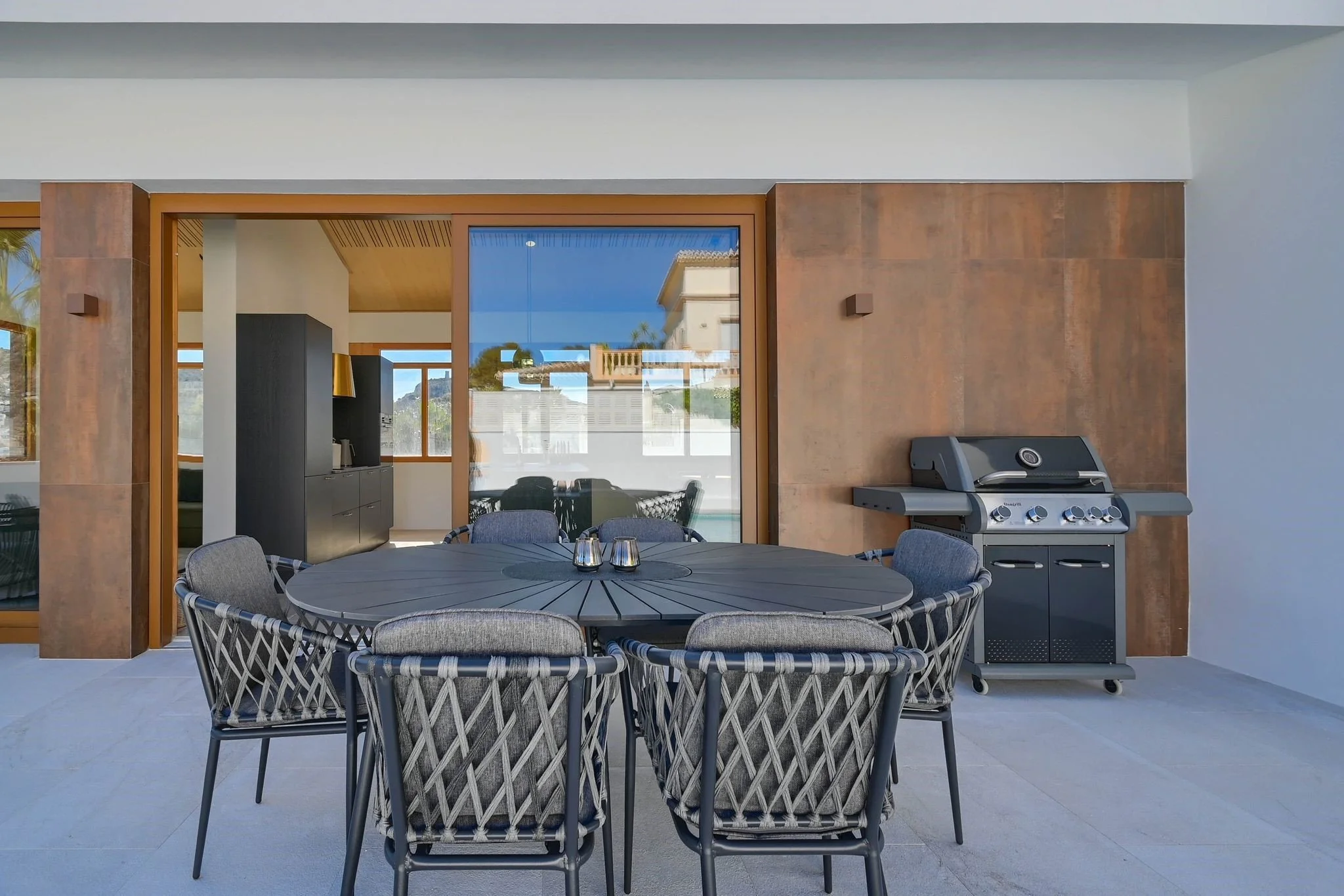 At our villa, you can take advantage of the beautiful weather and dine outdoors on the spacious terrace, which features a large dining table for enjoying meals with friends and family. Additionally, the villa has an outdoor barbecue area where you can grill up your favorite dishes and soak in the stunning surroundings. Enjoy a memorable vacation full of outdoor dining and relaxation at our villa.
